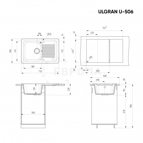 ULGRAN U-506 - односекционная реверсивная кухонная мойка, с глубокой чашей. Данная мойка устанавливается в шкаф шириной от 50 см и является оборачиваемой. В комплектацию входит сливная арматура с гофротрубой, технический паспорт и гарантийный талон. Заводская гарантия составляет 4 года, а срок службы данной мойки, при соблюдении основных правил ухода за ней, составляет более 10 лет. Мойки ULGRAN изготавливаются на современном автоматизированном оборудовании по инжекционной технологии (литье под давлением) и имеют сравнительно малый вес при высокой прочности, что обеспечивает высокий уровень качества и комфортности. Благодаря сочетанию полиэфирных смол и натуральных мраморных наполнителей полученный композитный материал в 8 раз прочнее натурального мрамора, абсолютно экологичен и безопасен для здоровья человека. Декоративно-защитное покрытие - гелькоут не имеет микропор и не впитывает никакие бытовые загрязнения, устойчиво к ультрафиолету, имеет антибактериальные свойства и надежно защищает от механических повреждений. Мойки ULGRAN устойчивы к термическим воздействиям и кипятку, имеют отличное шумопоглощение при падении струи воды и увеличенное сопротивление внешнему износу (царапинам, ударам). Мойки просты в уходе и без труда чистятся неабразивными средствами, очень долго сохраняя свой цвет и первозданный внешний вид.