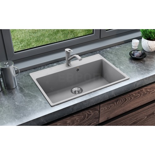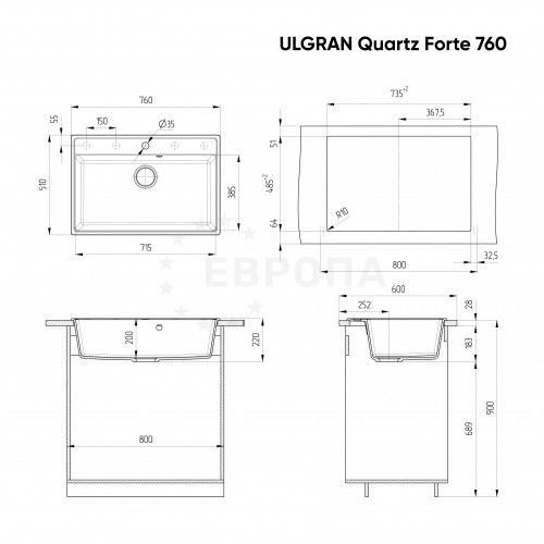 ULGRAN Quartz Forte 760 - профессиональная квадратная кухонная мойка с увеличенной чашей, изготовленная на современном автоматизированном оборудовании из высококачественных кварцевых композитов по инжекционной технологии (литье под давлением). Кварцевый композит является поистине инновационным материалом в производстве кухонных моек! Он сочетает в себе такие неоспоримые преимущества как повышенная влагостойкость и термостойкость, возможность придать мойке при изготовлении практичный и функциональный дизайн, увеличенное сопротивление внешнему износу, снижение уровня шума при падении струи воды, безусловная гигиеничность и простота в уходе, а также сравнительно малый вес при высокой прочности. Мойка является односекционной, с отверстием под смеситель, при этом существуют 4 дополнительно намеченных отверстия под аксессуары (дозатор или клапан-автомат). Мойка устанавливается в кухонный шкаф шириной от 80 см. Данная мойка имеет современный минималистичный дизайн и легко может стать украшением кухни и настоящим эргономичным центром. В комплектацию входит сливная арматура серии ""Элит"" с гофротрубой, технический паспорт и гарантийный талон. Заводская гарантия составляет 7 лет, а срок службы данной мойки, при соблюдении основных правил ухода за ней, составляет более 20 лет.