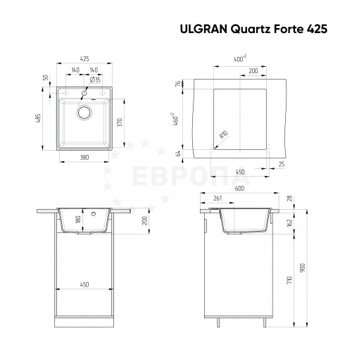 ULGRAN Quartz Forte 425 - компактная квадратная кухонная мойка с вместительной чашей, изготовленная на современном автоматизированном оборудовании из высококачественных кварцевых композитов по инжекционной технологии (литье под давлением). Кварцевый композит является поистине инновационным материалом в производстве кухонных моек! Он сочетает в себе такие неоспоримые преимущества как повышенная влагостойкость и термостойкость, возможность придать мойке при изготовлении практичный и функциональный дизайн, увеличенное сопротивление внешнему износу, снижение уровня шума при падении струи воды, безусловная гигиеничность и простота в уходе, а также сравнительно малый вес при высокой прочности. Мойка является односекционной, с отверстием под смеситель, при этом существуют 2 дополнительно намеченных отверстия под аксессуары (дозатор или клапан-автомат). Данная мойка имеет современный дизайн и прекрасно подходит для малогабаритной кухни. Установка в шкаф шириной от 45 см дает возможность осуществить монтаж мойки практически в любую столешницу и открывает широкий спектр возможностей при проектировании кухни. В комплектацию входит сливная арматура серии ""Элит"" с гофротрубой, технический паспорт и гарантийный талон. Заводская гарантия составляет 7 лет, а срок службы данной мойки, при соблюдении основных правил ухода за ней, составляет более 20 лет.